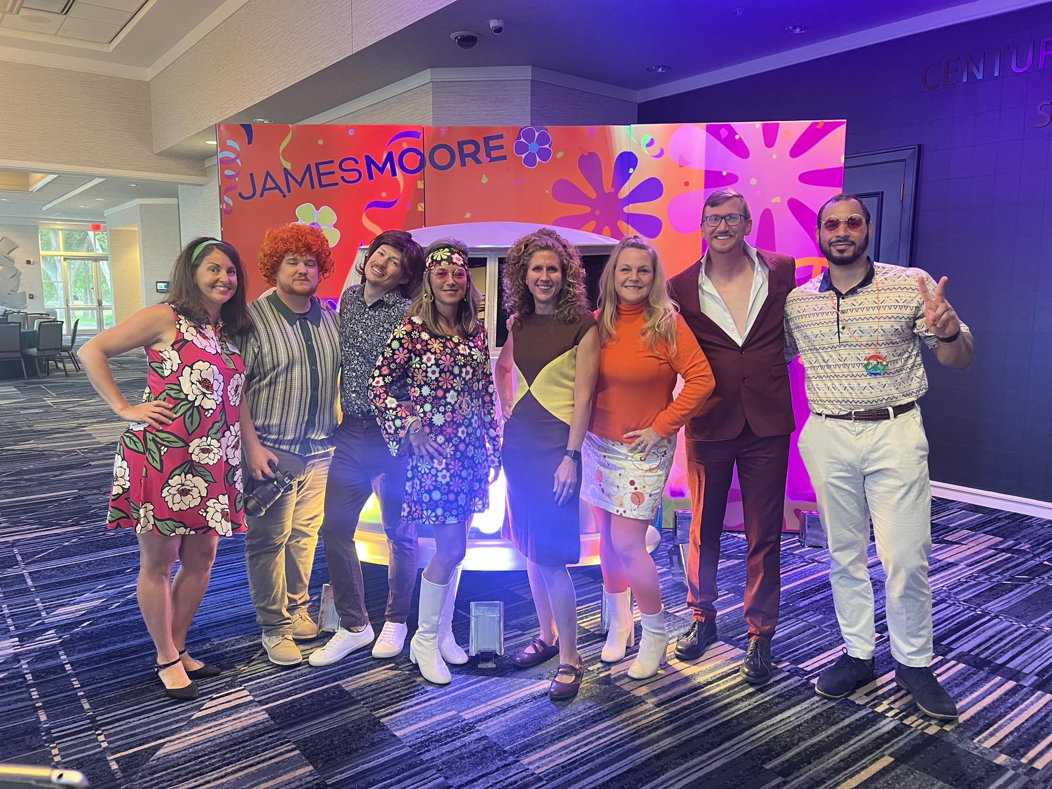 By the end of the afternoon, the fun was just beginning. The evening saw our meeting room transformed into a groovy dance palace for a 60s-themed celebration! Decked out in period garb, we meandered through mod furniture (not to mention the front of a VW Bus) and enjoyed fantastic food, music and the company of our James Moore family.
